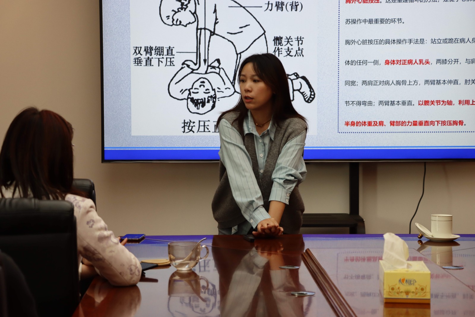 培訓中,張園老師主要圍繞心肺復蘇、氣道梗塞、意外傷害的現場救護等內容進行講解。培訓現場詳細講解了心肺復蘇以及氣道異物梗阻的急救具體步驟、方法和注意事項,并現場演示如何在“黃金時間4分鐘”內進行有效的心肺復蘇術。